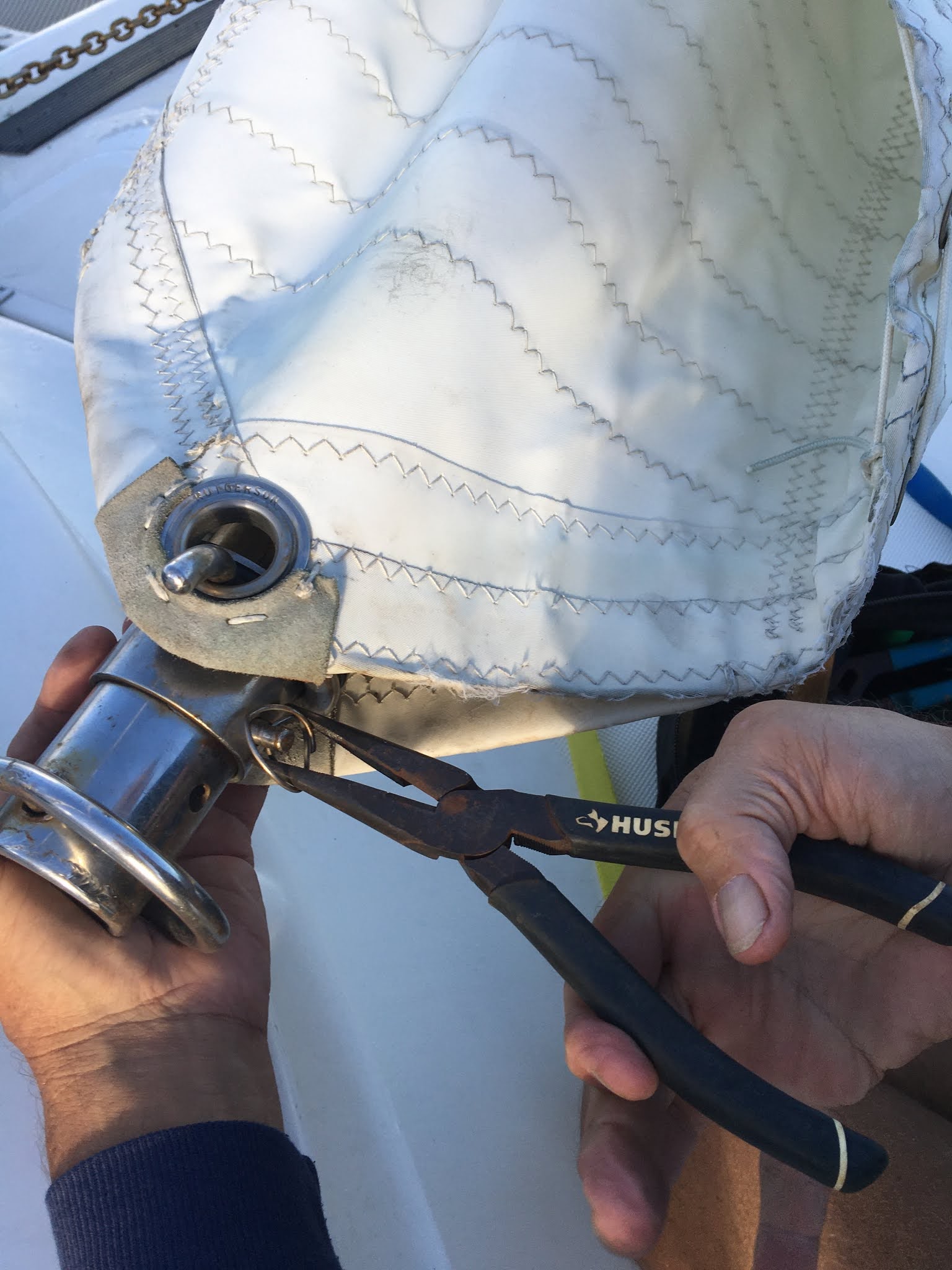 Another item today was that Dale had to perform underway repairs. During his walk about, he found on the deck a rather substantial ring used to keep screws, bolts, etc from backing out of where they belong.He picked it up, put it in his pocket and then tried to locate where it had fallen from. Most rings of this nature are on our life lines but this one was a heftier version thus, most likely, more important. Not finding anything right way, he slept on it; literally. Not the ring; the issue. After his rest period, he got up walked up to the jib, checked the end and sure enough, that’s where it belonged. Next I see him using the pair of pliers he had taken with him to hammer something. So I went below and grabbed a couple of hammers for him. Right about the time I came back up, he came back to the cockpit and selected the biggest one I had managed to find. I remembered the last time he and Gerry and tinkered something with the big hammer and hoped it wouldn’t result in the same outcome. He finally came back and announced that although he couldn’t get the pin through far enough to secure the ring through it, it was so wedged in place, it wasn’t going anywhere. He did caution me though, not to let the jib flail back and forth too much.